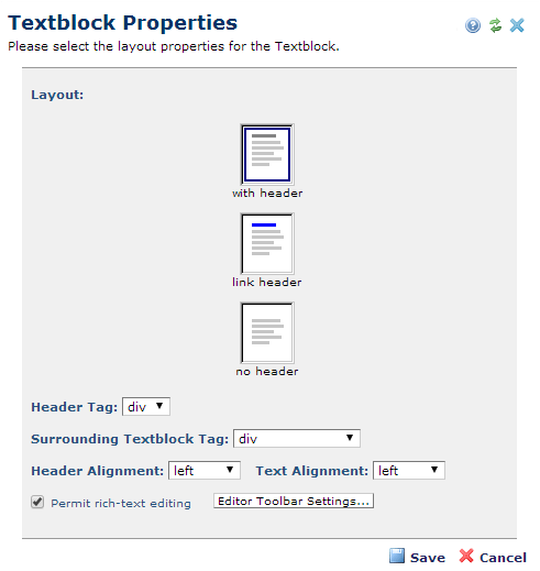 Check the box labeled “Permit rich-text editing” to allow enhanced flexibility in the creation and presentation of the text block. An Element that was created as a Formatted Text Block can be changed to Simple Text Block a by unchecking the Permit rich-text editing box. Likewise, you can change an Element created as a Simple Text Block to a Formatted Text Block by checking the Permit rich-text editing box.If you are not using style sheets,